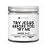 "Try Jesus Before You Try Me" scented candle – a playful yet powerful expression of patience and resilience. Infused with the serene aroma of coconut oasis, this candle transports you to a tranquil haven where worries fade away. As you light its flame, let the soothing fragrance wrap you in a sense of calm, creating an oasis of peace. The lighthearted message on the label reflects the sentiment of seeking inner harmony. Whether you're navigating challenging interactions or simply seeking solace, this candle serves as a reminder to choose a path of patience and understanding. Allow the comforting scent to guide you towards a place of tranquility, where grace and compassion prevail.
